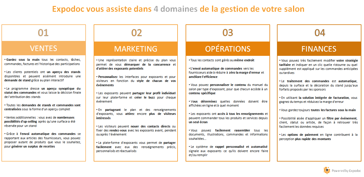 Your partner in crime Expodoc vous assiste dans 4 domaines de la gestion des salons Téléchargements DomainsOfExhibitionManagement_FR.PNG Retour à vue d'ensemble